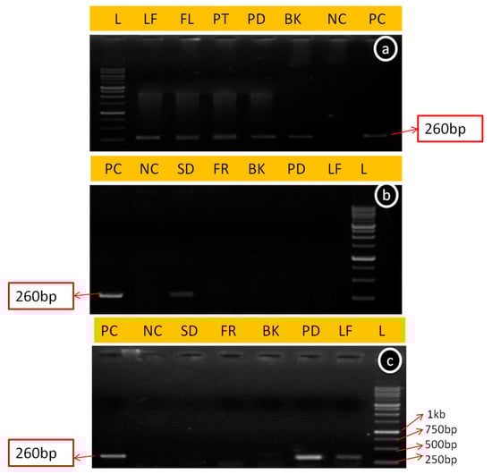 Amplicon of 260 bp amplified from ApMV-infected tissues of cultivar Golden Delicious (GD) plant tissues by conventional RT-PCR during the spring season (a), summer season (b) and autumn season (c), where L: ladder 100 bp, LF: Leaf, FL: Flowers, GD4:Bark, PT: Petals, PD: Pedicel, BK: Bark, FR: Fruit, SD: Seed, NC: Negative control, and PC: Positive control.