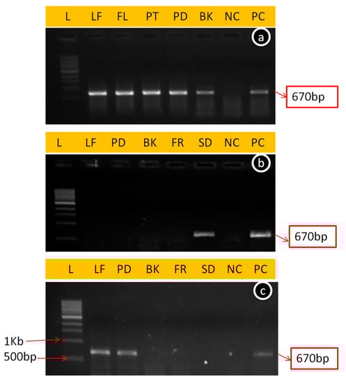 Amplicon of 670 bp amplified from ApNMV-infected tissues of cultivar Golden Delicious (GD) plant tissues by conventional RT-PCR during the spring season (a), summer season (b) and autumn season (c), where L: ladder 1 kb, LF: Leaf, FL: Flowers, GD4:Bark, PT: Petals, PD: Pedicel, BK: Bark, FR: Fruit, SD: Seed, NC: Negative control, and PC: Positive control.
