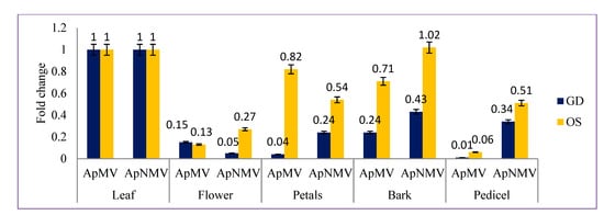 Comparative fold change of the CP gene of ApMV and ApNMV in different tissues in cultivar Golden Delicious (GD) and Oregon spur (OS) during the summer season. Y-axis represents the fold change in the virus infection, whereas X-axis represents different tissues tested for both viruses.