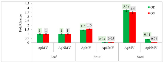 During the summer season, although the symptoms in the form of a less prominent mosaic pattern were present on leaves in both cultivars (GD and OS), seeds showed maximum ApMV titer (1.0) in both cultivars and leaves displayed minimum titer in both cultivars (0.26 in GD and 0.4 in OS).The ApNMV titer was maximum in leaves in both the GD and OS cultivars (1) and minimum in seed (0.4 for GD and 0.5 for OS).The fold change of coat protein gene expression in both the viruses in three different tissues during the summer season is shown in Figure 6.