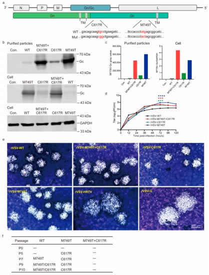 Previously, we found that rVSV-SFTSV/AH12-GP is genetically stable in Vero cells across six passages with a peak titer of 3 × 106 PFU/mL. However, the viral titer reached 8 × 107 PFU/mL when we continued to passage seven. Sequencing analyses revealed that an M749T substitution emerged in the Gc protein. In addition, another substitution in Gc, C617R, was found at passage nine with no significant increase in virus titer.