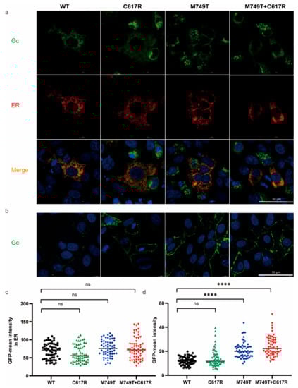 To determine the localization of mutant SFTSV glycoprotein, we transiently expressed the DsRed–KDEL fusion protein in Vero cells. The red fluorescent protein was targeted to the endoplasmic reticulum (ER) by N-terminal fusion to the signal peptide and retained there via a C-terminal KDEL-tag [47]. The cells were infected with rVSV-WT, rVSV-M749T, rVSV-C617R, or rVSV-M749T + C617R 24 h after transfection. As shown in Figure 1d, the titers of the mutant virus were no higher than those of the WT; thus, we analyzed the Gc protein localization within 24 h post-infection. Twenty-four hours post-infection, the Vero cells were fixed and stained using an antibody against Gc protein, while the nuclei were stained with Hoechst33342. Most of the mutant glycoproteins were localized in the ER, similar to the situation with the WT virus (Figure 2a). The quantitative analysis revealed no significant differences between the expression levels of WT and mutant Gc proteins (Figure 2c). Thus, M749T and C617R do not play a role in protein expression.