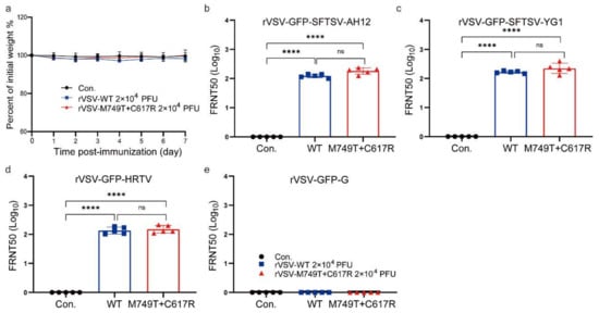 Mutated glycoproteins can potentially decrease immunogenicity. Groups of IFNAR−/− C57/BL6 mice were intraperitoneally (i.p.) immunized with a single dose of 2 × 104 PFU rVSV-WT, rVSV-M749T + C617R, or a medium control to evaluate the effect of M749T and C617R on the immunogenicity of the rVSV-SFTSV. Body weight was monitored for 1 week, and no obvious weight loss or other clinical signs were observed (Figure 3a).