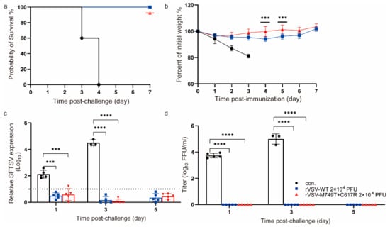 rVSV-WT and rVSV-M749T + C617R confer complete protection against lethal SFTSV Wuhan strain challenge in mice. (a) Survival rate of the mice after challenge. Immunized mice were i.p. challenged with a lethal dose of SFTSV (2 × 104 PFU) 30 days after immunization. (b) Body weight changes in mice after SFTSV challenge. Data are presented as the means ± SD. (c) SFTSV viral RNAs in the mice after challenge as measured using real-time PCR. The black bar is the mock-immunized control (con.); The dotted line represents the detection limit. (d) Viremia in the sera was measured using a plaque assay in Vero cells. Statistical significance was determined using multiple t-test. The above data are representative of two independent experiments. The p-value was determined using a two-sided multiple t-test; **** t-test, p < 0.0001; *** t-test, p < 0.001.