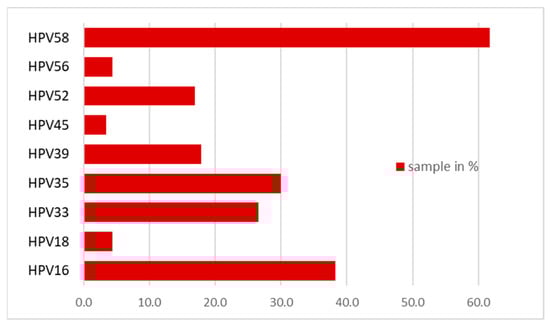 The presence of HPV in the oral cavity has been associated with various lesions, but the presence of viruses has also been found without clinical manifestation []. The link and relationship between prokaryotes and viruses has been proven, with some bacteria supporting the development of infections with certain viruses—directly and indirectly [,,]. The incidence of human papillomavirus (HPV)-related oropharyngeal squamous cell carcinomas is increasing globally. Common oral conditions such as periodontitis may contribute []. It was reported that the periodontal pathogens Fusobacterium, Prevotella, and Alloprevotella were enriched but commensal Streptococcus depleted in oral cavity squamous cell cancer []. The presence of high-risk human papillomaviruses in periodontal pockets patients of diagnosed with chronic periodontitis but not suffering from head and neck squamous cell carcinoma in the present day could link periodontitis to HPV-related squamous cell carcinoma. Prevalence studies detecting the presence of HPV in marginal periodontium as well as prospective studies of HPV-positive periodontitis patients are required to explore this possible link []. The aim of our study was to prove the relationship between periodontitis-causing bacteria and the presence of high-risk HPV genotypes in patients from Bulgaria. Patients have a pronounced clinical picture of periodontitis in the absence of oropharyngeal lesions in the oral cavity. In contrast to previous studies, our genotyping found that the most common genotype in samples positive for periodontitis bacteria was HPV type 58, followed by types 16, 33, and 35.