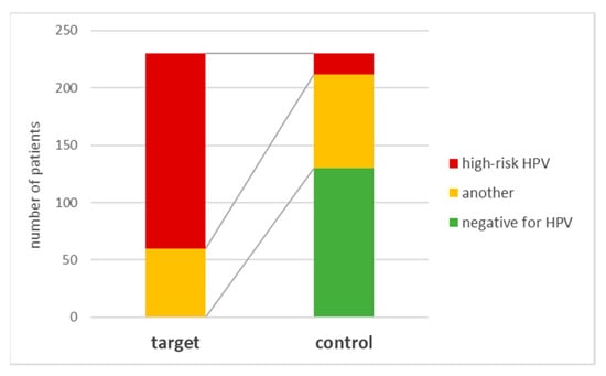 Eighteen genotypes positive for high-risk HPV, i.e., 7.8%, were found in the coronal margin samples in the control group. A statistically significant difference was found for this indicator (χ2 = 205; p < 0.001). The number of genotypes is also different when comparing samples taken from the coronal edge of the representatives of the target group and the control group—nine in the target group and only two genotypes in the control group for samples taken from the coronal edge.