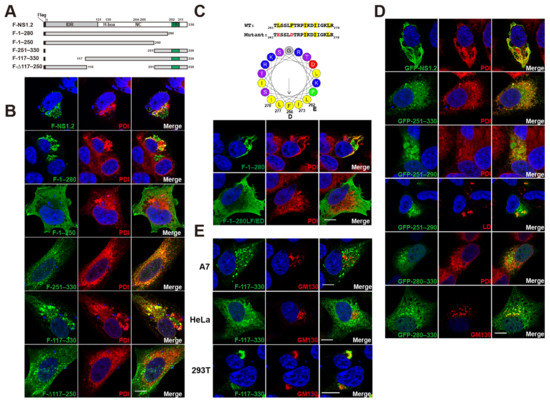 The domain of NS1.2 required for ER targeting and reorganization. (A) The schematic diagram shows the name and structure of Flag-tagged NS1.2 and its deletion mutants. (B) A7 cells were transfected with plasmids expressing Flag-tagged NS1.2, which is denoted as F-NS1.2, or its derivative mutants. Cells were fixed at 24h after transfection. Indirect immunofluorescence staining was performed using anti-Flag and anti-PDI antibodies and shown as green and red color, respectively. (C) The amino acid sequences between 261 and 278 of NS1.2 (1–280) and substituted mutant NS1.2 (1–280LF/ED) are shown on the top of the panel. The hydrophobic and acidic amino acids were highlighted in yellow and red, respectively. The helical wheel plot between 261 and 278 of NS1.2 predicted from computational analysis (accessed on 13 July 2021, https://heliquest.ipmc.cnrs.fr/cgi-bin/ComputParams.py) was shown. The hydrophobic and basic residues were shown in yellow and blue, respectively. The acidic residues are shown in red. The serine and threonine residues are shown in purple. The small amino acids are shown in grey. Proline is shown in green. The arrow represents the direction and magnitude of the hydrophobic moment. A7 cell were transfected with F-tagged NS1.2 (1–280), denoted as F-1–280, and substituted mutant, F-1–280(LF/ED). Cells were fixed at 24 h after transfection. Indirect immunofluorescence staining was performed using anti-Flag and anti-PDI antibodies. (D) A7 cells were transfected with plasmids expressing GFP-tagged NS1.2, (251–330), (251–290), or (280–330), which are denoted as GFP-NS1.2, GFP-251–330, GFP-250–290 and GFP-280–330, respectively. Cells were fixed at 24h after transfection, and indirect immunofluorescence staining was performed using anti-PDI or anti-GM130 antibodies, as indicated and shown in red color. LD was stained with LipidTox red neutral lipid dye. (E) The A7, HeLa, and HEK293T cells expressed Flag-tagged NS1.2 (117–330) were examined by immunofluorescent analysis using anti-Flag and anti-GM130 antibodies. 4′, 6-diamidino-2-pheylindole (DAPI) staining revealed the nucleus. Scale bar: 10 μm.