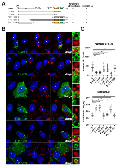 3.2. Analysis of the NS1.2 Domain Required for the Localization of LDs and Induction of Enlarged LDs
