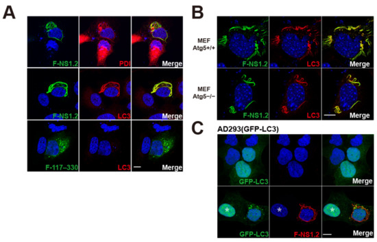 LC3 is recruited to NS1.2 localized ER filamentous membrane. (A) A7 cells, (B) MEF Atg5+/+ and MEF Atg5−/−, (C) AD293(GFP-LC3) were transfected with control plasmid ((C), 1st row) or plasmid expressing Flag-tagged NS1.2 or NS1.2 (117–330), denoted as F-NS1.2 and F-117–330, as indicated. Cells were fixed at 24 h after transfection. Indirect immunofluorescence staining was performed using anti-Flag and anti-PDI ((A), 1st row) or anti-Flag and anti-LC3 ((A), 2nd and 3rd row and (B)) or anti-Flag (C) antibodies. *: cell without expressing F-NS1.2. 4′, 6-diamidino-2-pheylindole (DAPI) staining revealed the nucleus. Scale bar: 10 μm.