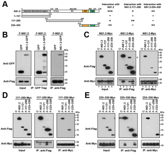 The domain involved in the dimerization/oligomerization of NS.1.2. (A) The schematic diagram shows the structure of NS1.2 and deletion mutants of NS1.2 and the summary of coimmunoprecipitation results. The “+”, “++”, and “+++” represent the relative level of Myc-tagged protein coimmunoprecipitated with Flag-tagged protein by anti-Flag antibody in each experiment. (B) HEK293T cells were cotransfected with plasmids expressing GFP or GFP-NS1.2 and Flag-NS1.2. Flagtagged NS1.2 is denoted as F-NS1.2. Proteins in the lysates were immunoprecipitated (IP) at 48 h after transfection using GFP-Trap, or anti-Flag conjugated magnetic beads and analyzed by immunoblotting using anti-GFP or anti-Flag antibodies as indicated. (C–E) HEK293T cells were cotransfected with plasmids expression of Myc-tagged NS1.2 (C), Myc-tagged H-box/NC domain (117–250) (D), or Myc-tagged membrane-targeting domain (233–330) (E) with a control plasmid, Flag-NS1.2 or NS1.2 deletion mutants as indicated. The control plasmid is denoted as C. Proteins in the lysates were immunoprecipitated (IP) at 48 h after transfection using anti-Myc or anti-Flag conjugated magnetic beads and analyzed by immunoblotting using anti-Myc or anti-Flag antibodies as indicated. “*”: suggested dimer form of F-117–250.