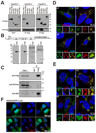 Cells were fixed with 4% paraformaldehyde and processed for indirect immunofluorescence staining. Fixed cells were then permeabilized and blocked by incubating in PBS containing 0.5% Triton X-100 and 2% Normal Goat Serum (Sigma Aldrich) for 15 min at room temperature. After washing with PBS containing 0.1% Triton X-100 and 0.2% BSA, cells were conducted with primary antibodies as indicated following incubation with fluorescently labeled secondary antibodies (Invitrogen, Thermo Fisher Scientific, Waltham, MA, USA). Primary antibodies used in this study are as follows: anti-PDI, GM130 (BD Biosciences, Franklin Lakes, NJ, USA), mouse and rabbit anti-Flag (Sigma Aldrich), anti-Myc (Cell Signaling), anti-LC3 (Nanotools, Teningen, Germany), anti-NS1.2 (this study), anti-NTPAse, and anti-NS4 [33]. LipidTox red neutral lipid stain (Invitrogen) was used to stain lipid droplets in fixed cells. Images were captured using a Leica SP5 fluorescence microscope. The representative images in different fields were chosen and captured from more than 100 cells. The images shown are representative of experiments carried out at least three times.