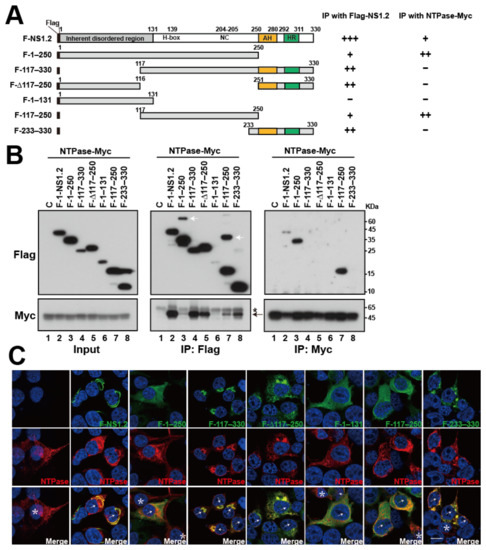 Furthermore, immunofluorescence staining revealed that NTPase displayed a web-like pattern in the cytoplasm, which is likely ER distribution, was distributed in the ER when expressed alone (Figure 7C, 1st column), whereas porting of NTPase was colocalized with NS1.2 at the filamentous ER structure when coexpressed with NS1.2 (Figure 7C, 2nd column, cell labeled with arrow). NTPase was also colocalized with NS1.2 (117–330), (Δ117–250), and (233–330) (Figure 7C, columns 4, 5, and 8), yielding evidence supporting the involvement of the membrane-targeting domain in the interaction with NTPase. Because NS1.2 (1–131), (1–250), and (117–250) displayed cytosolic distribution, detecting their colocalization through immunofluorescence staining was difficult. These results suggest that NS1.2 domains, both the H-box/NC and membrane-targeting domains, are involved in NS1.2 self-interaction and its interaction with NTPase.