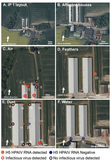 Infected premises 1 (IP1): Environmental sampling and presence or absence of H5 HPAIV RNA at a duck IP. (A,B). Map showing the layout of the IP with the two affected houses indicated, wind direction at time of sampling, the site where carcasses were loaded onto trucks (red star), and mortality and culling indicated. (C–F). The location of the environmental sampling and H5 RRT-PCR results showing the presence (orange) or absence (blue) of H5 HPAIV RNA in the sample and the positive isolation of infectious virus (red outline) or negative isolation of infectious virus (black outline). Samples were collected from air filters (C), feathers (D), dust (E), and water (F). Locations of wet straw samples (n = 2) and an Op swab from a dead duck (n = 1) are not shown but are indicated in Table S1.