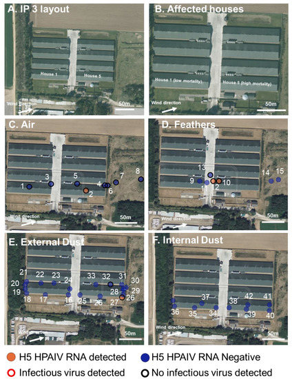 Infected premises 3 (IP3): Environmental sampling and presence or absence of H5 HPAIV RNA at a turkey IP. (A,B). Map showing the layout of the IP with the three affected houses indicated, wind direction at time of sampling, and mortality indicated. (C–F). The location of the environmental sampling and H5 RRT-PCR results showing the presence (orange) or absence (blue) of H5 HPAIV RNA in the sample and the positive isolation of infectious virus (red outline) or negative isolation of infectious virus (black outline). Samples were collected from air filters (C), feathers (D), external dust (E), and internal dust (F). Water and Op and Cl swabs from dead chickens are not shown but indicated in Table S3.