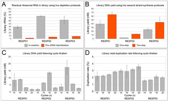 RAPIDprep development experiments. All results here are derived from the same sample extracts (RESP01-RESP03) run in duplicate and presented as mean values and error as standard deviation (SD). (A) The shaded bars are representative of the percentage of residual rRNA reads in the library following rRNA depletion with either an in-reaction cDNA synthesis method (grey) or a pre-cDNA hybridization approach (orange). The bars are clustered with respect to the sample they are derived from, labeled on the X-axis. (B) A comparison in total library yield, in nanomolar generated using Tapestation values, following a parallel experiment with a one-step and two-step second strand synthesis step using the Sequenase enzyme. The grey and orange shaded bars are representative of the one-step and two-step protocols, respectively. (C) Grey-shaded bars represent the total library yield of each sample under different library amplification cycling conditions. The X-axis is marked with the number of amplification cycles and is sub-grouped by source sample. (D) The duplication rate of reads generated in the final libraries following cycle titration; the number of cycles for each sample is indicated on the X-axis, and is sub-grouped by source sample.