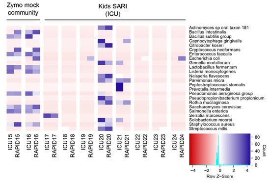 Comparison of RAPIDprep to commercial RNA library preparation kit. Using previously generated data for the kids SARI cohort, we compared the 24 most abundant species identified across both protocols for the same set of samples. An unclustered heatmap of microbial abundance (Z-score) is shown, with differences between samples identified by a deeper blue shading, while organisms conserved across samples are lighter blue through to red. A frequency histogram is overlayed on the color key and signifies the count of each Z score at any given point. Tick labels on the X-axis in the ICUXX format represent deep-RNA sequencing generated previously, while tick labels in the RAPIDXX format represent sequencing data generated in this study using the RAPIDprep assay for the corresponding samples.