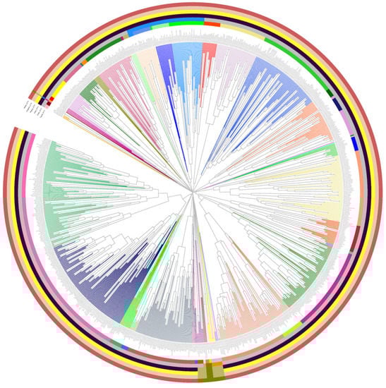 - Letunic, I.; Bork, P. Interactive Tree of Life (iTOL) v5: An online tool for phylogenetic tree display and annotation. Nucleic Acids Res. 2021, 49, W293–W296. [Google Scholar] [CrossRef] [PubMed]