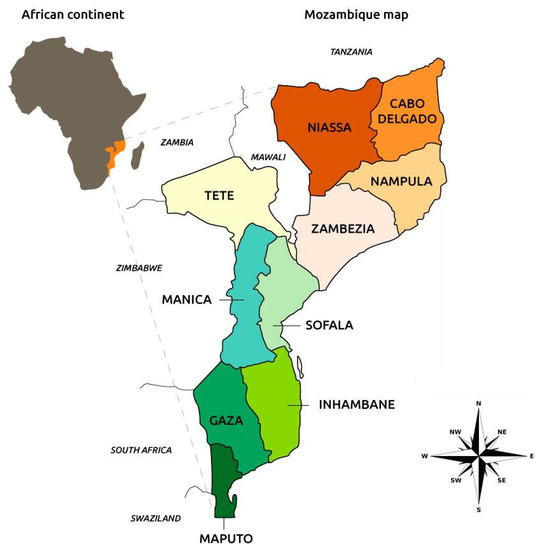 - MAEFP—Ministério da Administracao Estatal e Função Pública. Portal do Governo de Moçambique. Geografia de Moçambique. 2020. Available online: https://www.portaldogoverno.gov.mz/por/Mocambique/Populacao (accessed on 18 March 2022).