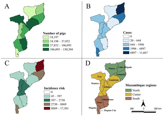 Spatial distribution of the average swine population (A); the total number of accumulated African swine fever (ASF) cases (B); incidence risk of ASF per 100,000 pigs (C); political division of Mozambique (D) between 2000 and 2020.