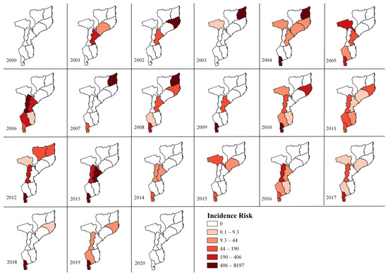 For the 21-year study, ASF cases were reported every year, except in 2000, when no cases were reported in any of the provinces of Mozambique (Figure 3). In 2020, Maputo reported an IR of 190 cases per 100,000 pigs. However, due to the small size of the city, the representation may not be clearly visualized (Figure 3). When analyzing the spatial distribution by region, the north recorded the first occurrence of ASF in Nampula in 2002 and Cabo Delgado in 2003 and 2004. Notably, Niassa had an IR of 101.3/100,000 in 2012 with a null risk in the remaining years. In contrast, during the period analyzed, cases of ASF were observed in Nampula in alternate years.