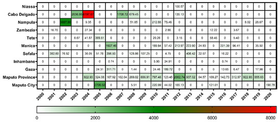 Currently, disease control is based exclusively on strict prophylactic sanitary measures. Measures such as (i) compulsive slaughter of infected and contacting animals, (ii) sanitary breaks, and (iii) bans on exporting products of animal origin have high economic costs for countries affected by ASF. Implementing preventative measures for ASF and other infectious diseases has proven to be difficult, especially in the informal sector. In Africa, in addition to trading through official channels, pigs and their meat are exchanged through informal events, such as ceremonies and family visits. Pig farmers and residents in the informal sector must have sufficient knowledge of diseases and preventive measures. Therefore, health education programs in this sector should continue, particularly for community leaders and agricultural extension agents. Similar to many African countries, in Mozambique, most ASF outbreaks in domestic swine have not been reported, and many other suspected outbreaks have never been laboratory-confirmed [3], mainly in the informal sector, intensifying the underreporting of official cases. However, in Mozambique, spatiotemporal analysis allows the identification of clusters with a higher risk of infection and a longer persistence time by identifying vulnerable areas, thereby contributing to official eradication programs and the implementation of active measures to control the disease [19]. In this context, this study sought to identify the regions with the highest risk for ASF through space-time analysis and assess temporal trends in different provinces of Mozambique over 20 years (2000–2020).