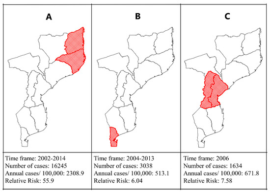Spatiotemporal distribution of African swine fever in Mozambique between 2000 and 2020. Red represents clusters formed: primary (A) and secondary clusters (B,C).