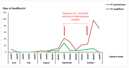Collected sandflies by sticky traps on a weekly basis during the study period were identified to species level. The phenology of sandflies of the subgenus Larroussius, including P. perniciosus and P. perfiliewi showed two main peaks: a small one in June and a second larger one in September–October (Figure 1).