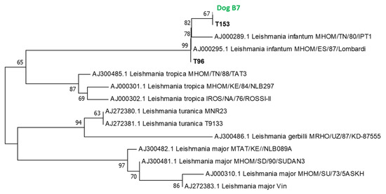 All PCR products were sequenced, except for dog B0, which contains P. perniciosus fed on dog B at day 0 post-blood feeding (day 0). Identified Leishmania DNA sequences are closely related to the reference sequence of L. infantum AJ000289 from Lombardi and L. infantum MHOM/TN/80/IPT1 isolated from Tunisia in 1980. Phylogenetic analysis showed that all Leishmania sequences (Dog B7, T96 and T153 corresponding to GenBank accession numbers OP788110, OP788108 and OP788109, respectively) clustered together with the L. infantum reference sequence. The phylogenetic branch including L. infantum sequences was supported by a high bootstrap value estimated at 99% (Figure 2).