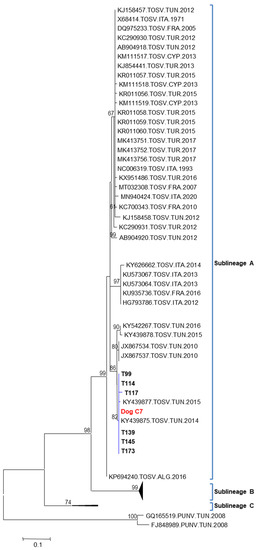 All PCR products except for dog C0 obtained using primers located in the polymerase (gene L RNA segment), were cloned and sequenced, giving partial sequences of 201 bp. The phylogenetic tree based on partial nucleotide sequences of the polymerase gene showed that TOSV sequences identified in this study and those previously described in 2010, 2014, 2015 and 2016 were grouped together in sublineage A within a single phylogenetic cluster with a high bootstrap value estimated at 86% (Figure 3). Although the sequence used for phylogenetic analysis is short, (i) many studies have been based on this short region of the genome and therefore they allow us to gather the largest genetic diversity of TOSV sequences, (ii) the high values of the bootstrap analysis support that the clustering is solid (Figure 3), and (iii) the detailed analysis of the alignment showed that there is an important variability between the selected sequences that support the subclustering in five groups within lineage A. Of course, the shortness of the region does not allow us to infer elaborated phylogenetic conclusions, but we believe they adequately reflect the genetic diversity observed between strains from different countries and support the conclusions of our study. It is important to note that TOSV sequences identified in this study were not grouped with those previously reported in 2012 from Tunisia (Figure 3). GenBank accession numbers corresponding to the seven TOSV sequences detected in our study are OP793856 (dog C7), OP793850 (T99), OP793851 (T114), OP793852 (T117), OP793853 (T139), OP793854 (T145), and OP793855 (T173).
