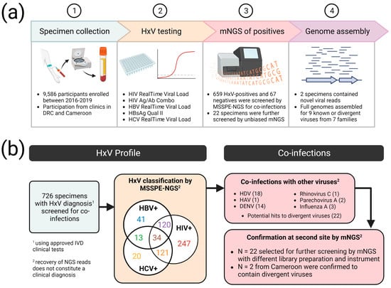 Study flow chart. (a) Testing regime for specimens, and (b) quantification of viral diagnoses and viral identifications via deep sequencing. (Figure created with BioRender.com).