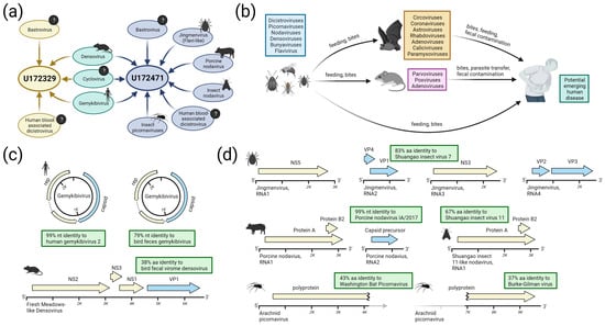 Several of the reads found in either U172329 and/or U172471 shared sequence homology with presumed insect viruses (Figure 2c,d). Predation and other animal-to-animal contact cycles are possible routes for these viruses to come into contact with humans (Figure 2b). Below, we describe these viruses in detail.