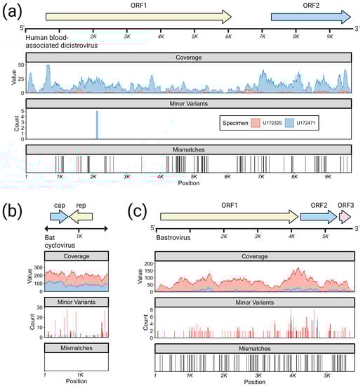 Genomic maps and mapping statistics for three viruses found in specimens U172329 and U172471 that have previously been detected in mammals: (a) human blood-associated dicistrovirus, (b) bat cyclovirus, and (c) bastrovirus. In each panel, mismatches represent single-nucleotide polymorphisms detected between the U172329 and U172471 isolates (Figure created using assets from BioRender.com).