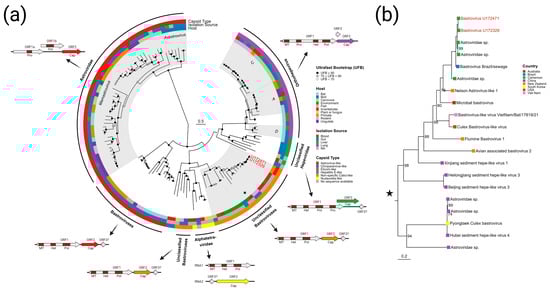 Due to the relatedness between bastroviruses and human disease-causing astroviruses (Astroviridae) and hepatitis E-like viruses (Hepeviridae), as well as the relative lack of phylogenetic data for bastroviruses, we reconstructed an ML phylogeny of these three groups (Figure 4). All available amino acid sequences of the RdRp domain of ORF1 from viruses annotated as “bastrovirus” were compared to representative sequences from the astroviruses and hepatitis E-like viruses (Figure 4a). Data regarding sampled host, isolation source, genome organization, and capsid type (deduced from the GenBank metadata, BLASTp searches, and pfam protein family prediction []) were also integrated to provide comparative analysis. Isolates currently annotated as “bastrovirus” were observed to form a paraphyletic group branching closer to the Hepeviridae than to the Astroviridae. Inspection of the clades of bastroviruses reveals similarities in genome organization, but differences in capsid relationships. The first bastroviruses discovered, Bastroviruses 1-7 from human stool [], and close relatives form a monophyletic group (labeled “Bastroviruses” in Figure 4a); members of this group contain capsids with a high level of similarity to those from the Astroviridae. Viral genomes in this monophyletic group have been exclusively recovered from the gut virome of vertebrates.