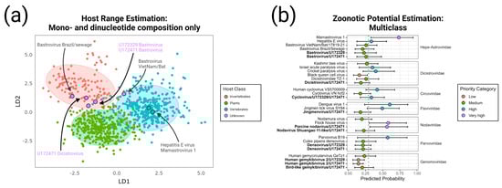 Assignment of host class and zoonotic potential. (a) The canonical score plot of a linear discriminant analysis used to classify picorna-like viral sequences into three host groups using all 4 mononucleotide and all 16 dinucleotide frequencies. The plot shows the separation of host groups through the two most statistically significant factors. The training dataset with known host range (n = 945 genomes) was used to establish a scoring profile such that the viral sequences with unknown host could be classified. The ellipses represent the 90% confidence level (i.e., 90% of sequences fitting a host range group fit inside the ellipsis) centered on the centroid of each group. Sequences from the bastroviruses from U172329 and U172471, the dicistrovirus from U172471, and four comparator sequences are labeled separately. (b) Predicted probability of human infectability for all novel viruses identified in this study and closely related comparator sequences. Dots show the mean and bars show the 95% interquartile range of predicted probabilities across the best-performing 10% of iterations. The cut-off for zoonotic potential was set at 0.293 with priority categories assigned as previously described []: low: mean and upper/lower interquartile ranges below cutoff; medium: mean below cutoff but upper interquartile range above cutoff; high: mean above cutoff but lower interquartile range below cutoff; very high—mean and upper/lower interquartile ranges above cutoff. In both panels, the dicistrovirus recovered from specimen U172329 was not analyzed due to its low (45%) total coverage.