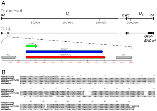 - Stanton, R.J.; Baluchova, K.; Dargan, D.J.; Cunningham, C.; Sheehy, O.; Seirafian, S.; McSharry, B.P.; Neale, M.L.; Davies, J.A.; Tomasec, P.; et al. Reconstruction of the complete human cytomegalovirus genome in a BAC reveals RL13 to be a potent inhibitor of replication. J. Clin. Investig. 2010, 120, 3191–3208. [Google Scholar] [CrossRef] [PubMed]