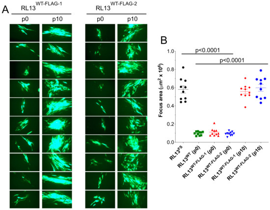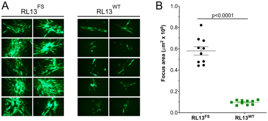 GalK recombineering in E. coli, as described in Section 2, was used to repair the RL13 mutation in the TL12 BAC to the presumed wild-type sequence by removing the one-bp insertion. The resulting RL13-repaired BAC was transfected into fibroblasts to produce a p0 stock of virus designated TL12-RL13WT. To compare the size of foci produced by TL12-RL13WT to those produced by the parental virus TL12-RL13FS, MRC-5 cell monolayers were infected at low MOI, and the size of individual foci produced by each virus was determined based on its GFP+ surface area at day eight post-infection. TL12-RL13WT grew slowly and produced much smaller foci compared to the parental virus TL12-RL13FS (Figure 2A). The surface areas of ten GFP+ foci formed by each virus were measured at day eight post-infection using the ImageJ software. Foci formed by TL12-RL13WT were fivefold smaller than those formed by TL12-RL13FS (p < 0.0001) (Figure 2B). Thus, expression of an intact RL13 protein significantly impaired virus growth in the context of the highly cell culture-adapted Towne strain genome.