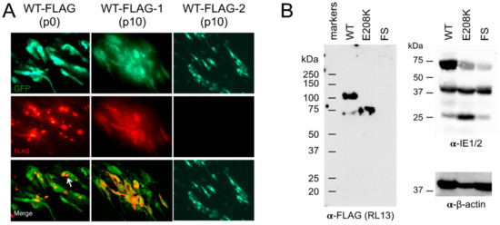 MRC-5 monolayers infected with the p0 stock of TL12-RL13WT-FLAG or the p10 stocks of TL12-RL13WT-FLAG–1 or TL12-RL13WT-FLAG–2 were stained at day eight post-infection with an α-FLAG monoclonal antibody followed by Alexa Fluor 594-conjugated α-mouse secondary antibodies. RL13-FLAG was detected in large perinuclear structures consistent with the VAC in cells infected with the p0 stock of TL12-RL13WT-FLAG–1, but it dispersed within the cytoplasm in cells infected with the p10 stock (Figure 4A), suggesting that the E208K substitution predominant in this latter stock was associated with a partial re-localization of RL13 away from the VAC. No FLAG signal was detected in cells infected with the p10 stock of TL12-RL13WT-FLAG–2 (Figure 4A), consistent with the dominant presence of a two-bp deletion/frame shift in RL13 eliminating expression of the C-terminal FLAG epitope. Similarly, no signal was detected in cells infected with TL12-RL13FS-FLAG.