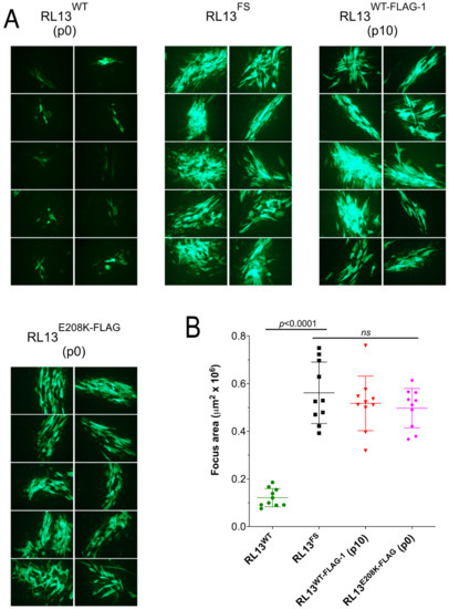 A search of 15 available RL13 sequences in the NCBI database revealed that E208 is 100% conserved, suggesting that mutation to K208 may negatively impact RL13 functions. GFP-based analysis of focus size revealed that viruses in the p0 stock of TL12-RL13E208K-FLAG formed large foci similar in size to those of TL12-RL13FS and the p10 stock of TL12-RL13WT-FLAG–1 (Figure 5). TL12-RL13E208K-FLAG and TL12-RL13FS-FLAG also exhibited similar levels and kinetics of infectious progeny production, while cell-free and cell-associated TL12-RL13E208K-FLAG progeny production peaked at 2.8-fold and 5.5-fold higher, respectively, than that of TL12-RL13WT-FLAG (Figure 6).