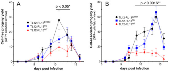 The E208K substitution relieves RL13 restriction of viral replication. Replicate MRC-5 cultures were infected with the indicated viruses at an MOI of 0.3 pfu/cell. On alternate days, post-infection progeny virus yields were determined in culture supernatants (cell-free progeny, A) or in cell sonicates (cell-associated, B) by infecting fresh monolayer cultures and counting the numbers of GFP+ cells per field of view at day three post-infection. Data shown are means of triplicate assays +/− one standard deviation. * TL12-RL13E208K vs. TL12-RL13WT, days 11–13; ** TL12-RL13E208K vs. TL12-RL13WT, days 9–16.