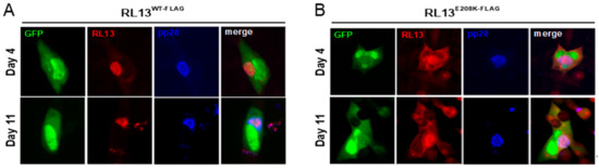 3.5. The E208K Mutation Disrupts RL13 Localization and Function