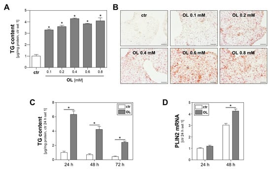 Effect of oleate treatment on lipid accumulation in Calu-3 cells. (A,B) Calu-3 cells were incubated with increasing oleate (OL) concentrations for 24 h. Cells treated with FFA-free BSA served as controls (ctr). (A) Triglyceride (TG) content normalized to cellular protein content (*: p < 0.05 compared to ctr). (B) Oil Red O staining; scale bars 50 µm. (C,D) Calu-3 cells were incubated with 0.6 mM OL or FFA-free BSA (ctr) for different time intervals, as indicated. (C) Triglyceride (TG) content normalized to cellular protein content and (D) PLIN2 mRNA levels analyzed by quantitative RT-PCR (*: p < 0.05).