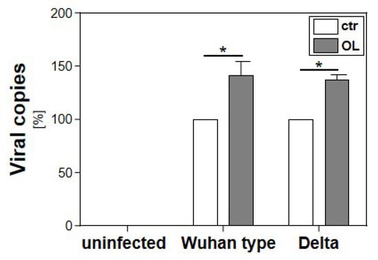 Effect of cellular lipid accumulation on the replication of SARS-CoV-2 Wuhan type or Delta. Calu-3 cells were incubated with 0.6 mM oleate for 5 h prior to infection with the SARS-CoV-2 Wuhan type or the VoC Delta (MOI of 2 × 10−2 for 1 h). Cell culture supernatants were harvested three days post infection. The virions were purified and analyzed by qRT-PCR. Bars show mean values of three independent experiments ± SEM (*: p < 0.05).