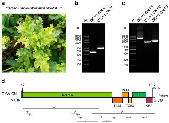 Symptoms, molecular cloning, and genome structure of the Chinese isolate of Carya illinoinensis carlavirus 1 (CiCV1-CN) from Chrysanthemum morifolium. (a) Symptoms of CiCV1-CN in C. morifolium. (b) 5′- and 3′-RACE (rapid amplification of cDNA ends) cloning of CiCV1-CN. M: DNA marker. (c) Reverse transcription PCR (RT-PCR) cloning of internal genomic fragments (F1, F2, and F3) of CiCV1-CN. M: DNA marker. (d) Genomic organization of CiCV1-CN. The predicted open reading frames (ORFs) are marked with different rectangles, and 13 contigs assembled from virus-derived small RNAs are indicated with black lines.