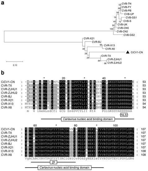 Previous studies have shown that the CRPs of the genus Carlavirus play a crucial role in causing viral symptoms [13,30,56]. We, therefore, examined the phylogenetic relationships of CiCV1-CN CRP with the other CRPs encoded by carlaviruses from C. morifolium. As expected, CiCV1-CN CRP was clustered closely with the CRPs encoded by the Carlavirus CVR (Figure 4a). This result suggests that the relationship between CiCV1-CN CRP and Carlavirus CVR CRPs is closer during the evolution. Further amino acid sequence alignment of CRPs showed that CiCV1-CN CRP had a conserved Carlavirus nucleic acid binding domain (IPR002568, 8–92 aa) (Figure 4b). Furthermore, CiCV1-CN CRP was also predicted to have an arginine-rich NLS motif (47RRRR50) and a ZF motif (57CX2CX12CX4C78) located adjacent to the NLS (Figure 4b). These results suggest that CiCV1-CN CRP may be a potential pathogenicity factor during viral infection.