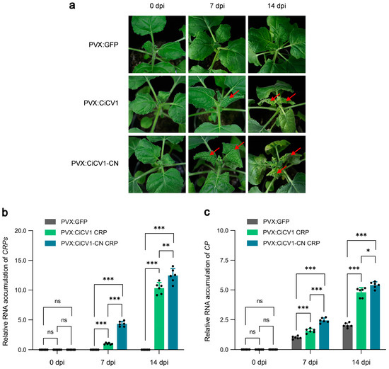 To further determine the roles of CiCV1 CRP and CiCV1-CN CRP in the viral infection, we transiently expressed them in wild-type N. benthamiana plants using the PVX-based vector. Compared with N. benthamiana seedlings agro-inoculated with PVX:GFP, plants agro-inoculated with either PVX:CiCV1 CRP or PVX:CiCV1-CN CRP showed typical downward leaf curl at 7 dpi, especially those agro-inoculated with PVX:CiCV1-CN CRP (Figure 5a). Notably, N. benthamiana seedlings agro-inoculated with both PVX:CiCV1 CRP, and PVX:CiCV1-CN CRP exhibited a severe downward leaf curl with hypersensitive cell death at 14 dpi (Figure 5a). To verify the above observations, we determined the RNA accumulation of CRPs of CiCV1 and CiCV1-CN using qPCR. The results showed that CRP transcripts were significantly accumulated in the systemic leaves of N. benthamiana plants agro-inoculated with either PVX:CiCV1 CRP or PVX:CiCV1-CN CRP at 7 and 14 dpi (Figure 5b). Furthermore, we also found that the transcripts of PVX CP were dramatically accumulated in the systemic leaves of N. benthamiana plants with prolongation of inoculation time, especially in those of agro-inoculation with PVX:CiCV1 CRP and PVX:CiCV1-CN CRP (Figure 5c), indicating that CiCV1 CRP and CiCV1-CN CRP can increase the viral titer of PVX. Together, these results suggest that the transient expression of CiCV1-CN CRP can induce viral symptoms in N. benthamiana, and CiCV1-CN CRP is a pathogenicity factor of CiCV1-CN during viral infection.