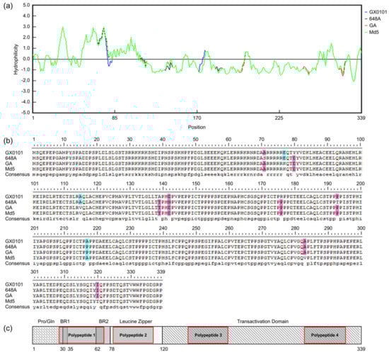 Amino acid sequence alignment, hydrophilicity and molecular structure analysis of the Meq proteins. (a) Comparison of amino acid hydrophilicities of different virulence MDV−1 Meq proteins. The upper half of the baseline represents the hydrophilic regions. The green curve represents the Md5 strain used as reference. The blue, black and red curves represent the amino acid difference region of GX0101, 648A and GA strains relative to Md5 strain, respectively. (b) Amino acids point mutation analysis of the Meq proteins of four MDV−1 strains with different virulence. Blue and pink indicate the mutant amino acids of different strains. (c) The genomic location and domain diagram of MDV−1 Meq protein. The relative positions of synthetic polypeptides are shown by shaded grey boxes with red brackets.