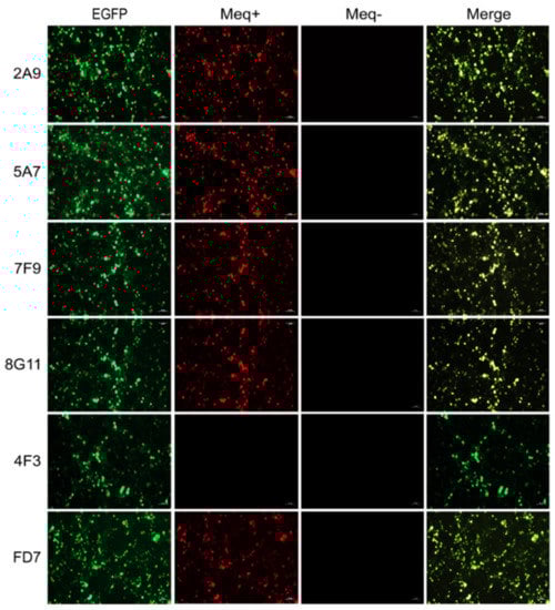 Staining of the Meq proteins overexpressed in 293T cells by immunofluorescence assay. The 293T cells transfected with the recombinant or empty plasmids, pEGFP-N1-Meq (Meq+) and pEGFP-N1 (Meq-), were fixed at 48 h post transfection, and then incubated with the candidate Meq antibodies and DyLight 594 labeled Goat Anti-Mouse IgG sequentially. The anti-Meq mAb FD7 served as a positive control. EGFP, enhanced green fluorescent protein with auto-fluorescence in green; Meq, MDV−1 specific oncoprotein stained in red; Merge, merged image in yellow. (Scale bar = 50 µm).