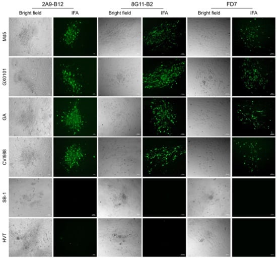 Cross reactions of mAbs 2A9-B12 and 8G11-B2 to the viral plaques produced by different types of MDVs detected by IFA staining. The reaction spectrums of newly developed Meq mAbs to different types of MDV and HVT were determined by IFA staining. The anti-Meq mAb FD7 served as a positive control. Bright field, images of virus plaques under regular light; IFA, immunofluorescence assay. (Scale bar = 50 µm).