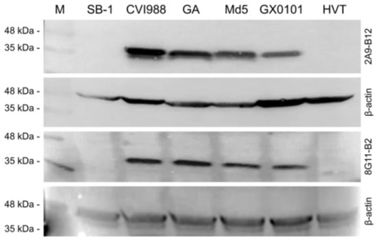 - Ono, M.; Jang, H.K.; Maeda, K.; Kawaguchi, Y.; Tohya, Y.; Niikura, M.; Mikami, T. Preparation of monoclonal antibodies against Marek’s disease virus serotype 1 glycoprotein D expressed by a recombinant baculovirus. Virus Res. 1995, 38, 219–230. [Google Scholar] [CrossRef]