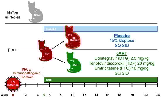 Eighteen cats (n = 18) from 6 to 10 months old, bred from a specific pathogen free colony, were utilized for the present study. The cats were housed in barrier rooms and fed ad libitum in accordance with Colorado State University IACUC-approved protocols at an AAALAC-international accredited animal facility. The cats were housed in groups of 3 to 4 animals, and control cats were housed separately from FIV-infected cats. Two weeks prior to the initiation of the study, the cats were habituated to handling for blood and saliva collection and physical examination. At day 0, n = 12 cats were intravenously and orally inoculated with 1 mL of FIVc36 viral stock diluted 1:80 with 0.9% saline, previously validated to demonstrate acute immunopathogenic and reproducible high viral titers [9,36]. The remaining n = 6 cats were similarly sham-inoculated with 1 mL of 0.9% saline as negative controls. Beginning at week 5 post-inoculation through week 24, n = 6 FIV-inoculated cats received daily combination antiretroviral therapy (cART) subcutaneously consisting of two reverse transcription inhibitors, tenofovir disoproxil fumarate (TDF 20 mg/kg/day) and emtricitabine (FTC 40 mg/kg/day), and an integrase inhibitor dolutegravir (DTG 2.5 mg/kg/day). The other n = 6 FIV-inoculated cats received 1 mL subcutaneous injections of 15% kleptose, the cART vehicle, daily. These three cat groups were referred to as control, cART-treated FIV+, and placebo-treated FIV+ cats, respectively. Figure 1 illustrates the distribution of cat groups. All cat groups were equally distributed with female-intact and male-neutered cats, and FIV infection and treatment assignments were randomized. Physical examination recordings were conducted for each cat at all blood and saliva collection timepoints, and included weight, temperature, heart rate, respiratory rate, mentation, oral cavity (i.e., mucous membrane color, capillary refill time, and gingival exam), lymph node palpation, and abdominal palpation (Appendix A).